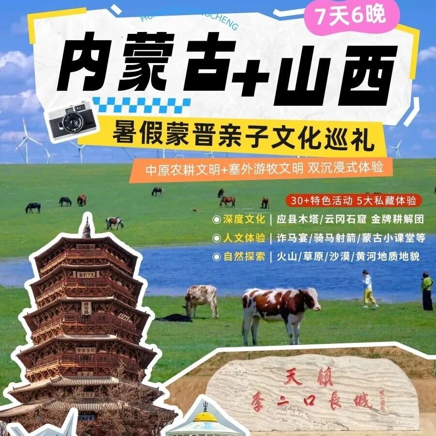 内蒙古+山西7天亲子研学,成人4580起/儿童3580起,早鸟省1000。4-14岁亲子家庭,体验火山草原+古建研学,一价全包。提前15天无损退改,需确认成团。 Tags: 蒙晋亲子营 内蒙古草原 山西古建 火山研学 暑假亲子 暑假想带...