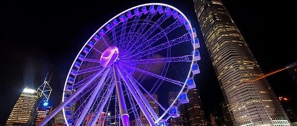 香港摩天轮就在中环海滨活动空间内,可以360°无死角看尽维港两岸风光:中环高楼、九龙天际线、星光大道尽收眼底。