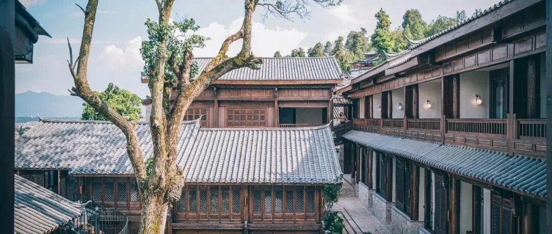 公区的庭院没有走古城其他酒店的水系设计,而是差异化地做了一个园林,两棵醒目地苍天大树也颇有故事。