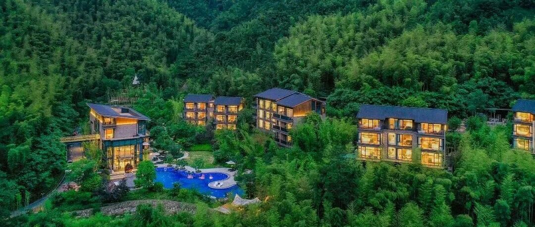 酒店位于浙闽皖赣四省交界处,在海拔近千米的山上,环境是一绝。周围山体被万亩竹林覆盖,千山叠翠,山中天然形成的大大小小的瀑布,可以泡在泳池看云海。