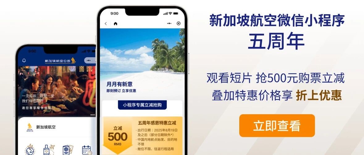 上周跟大家分享了新加坡航空微信小程序5周年大促,活动正火热进行中,购票立减500元!