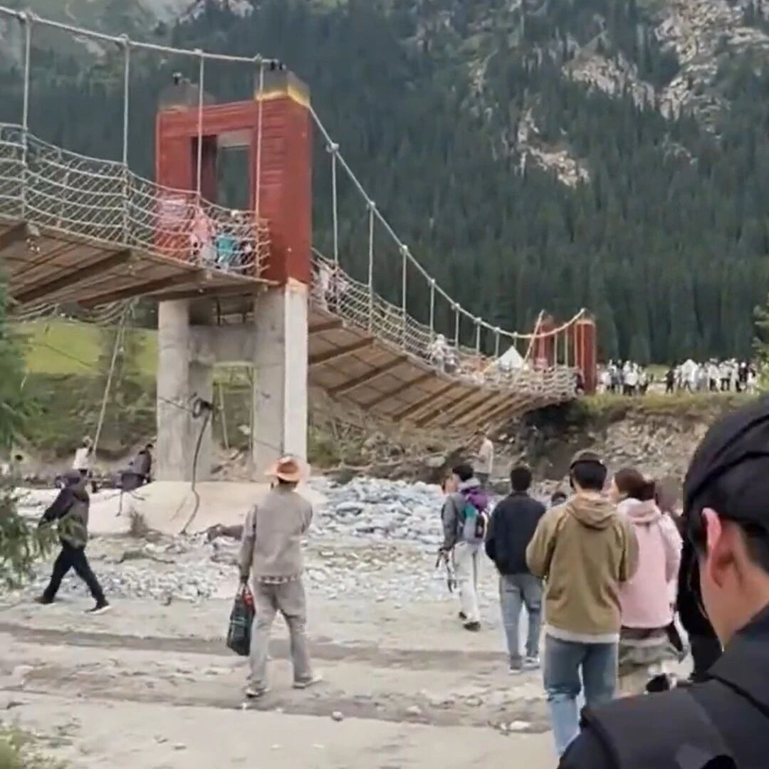 8月6日,新疆伊犁州昭苏县夏塔旅游风景区内,一座吊桥发生绳索断裂,桥面倾斜,有部分游客从桥上跌入湍急河流中。