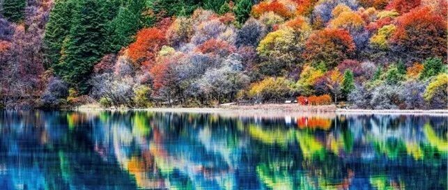 五花海:九寨沟的颜值担当,也是明信片封面。湖底沉积的钙华、藻类、倒木让湖水呈现蓝、绿、黄、墨等色彩,宛如一幅打翻的调色盘。秋天彩林倒映,更加斑斓。