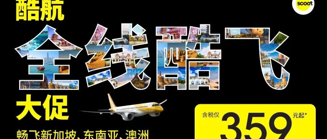 酷航年度"全线酷飞"大促正式上线,从新加坡的都市霓虹到巴厘岛的落日海滩,从吉隆坡的双子塔到槟城的街头美食,单程含税359元起拿下,限时6天抢!