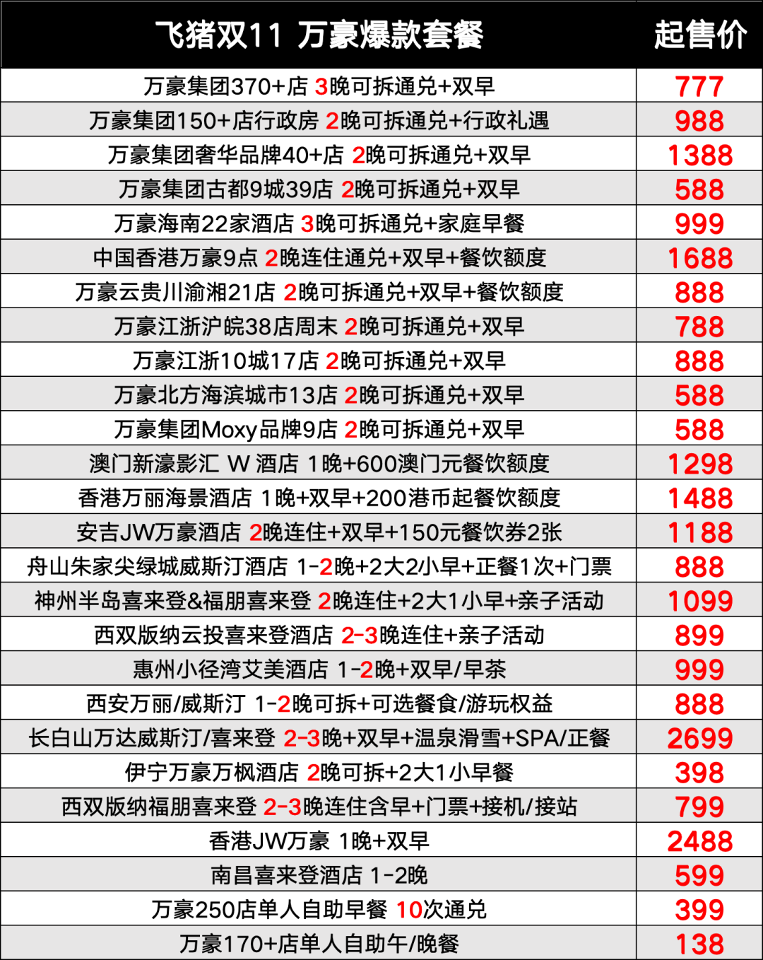 1288/2晚档:每晚给80元餐饮额度,重庆万豪行政公寓、重庆富力艾美、峨眉山恒邦艾美(近景区和高铁站)、西双版纳云投喜来登(后面有单体酒店套餐,价格比通兑更好);