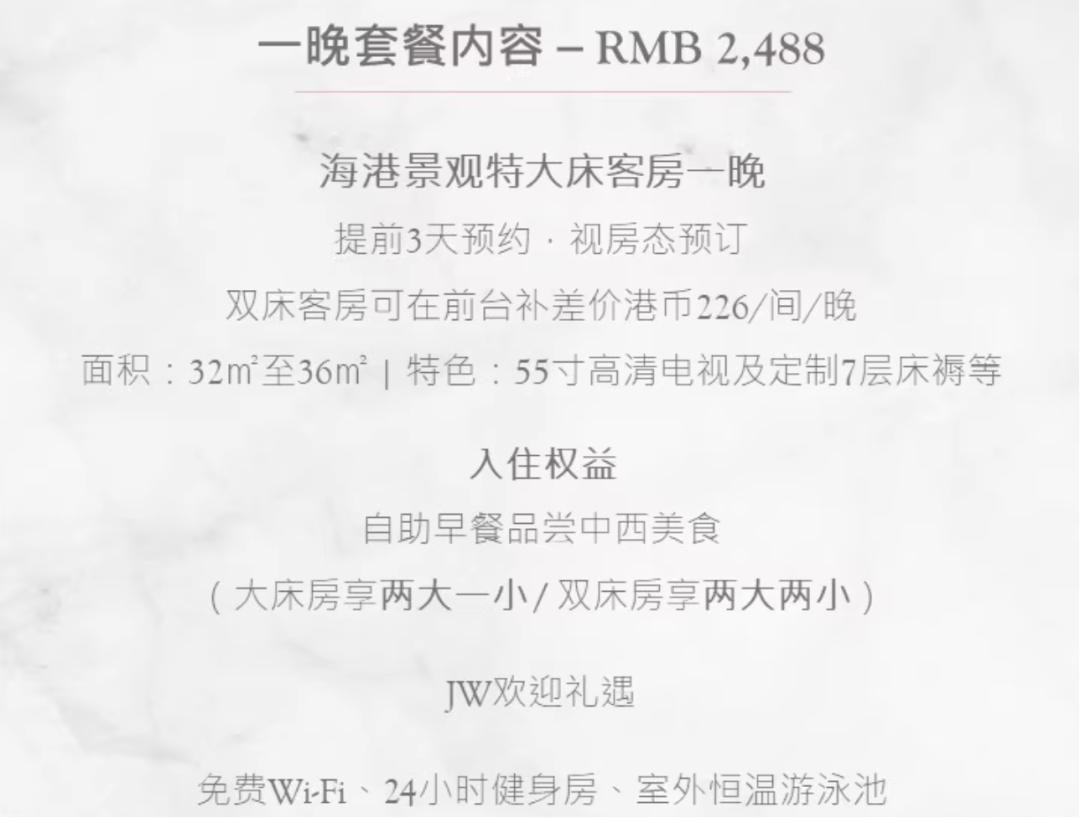 2588/2晚档:海洋公园万豪(去香港海洋公园必囤款)、东涌世茂喜来登(近大屿山、迪士尼乐园)、数码港艾美(尊贵南区位置)。数码港艾美是400港币餐饮消费,其它都是300港币的餐饮消费额度;