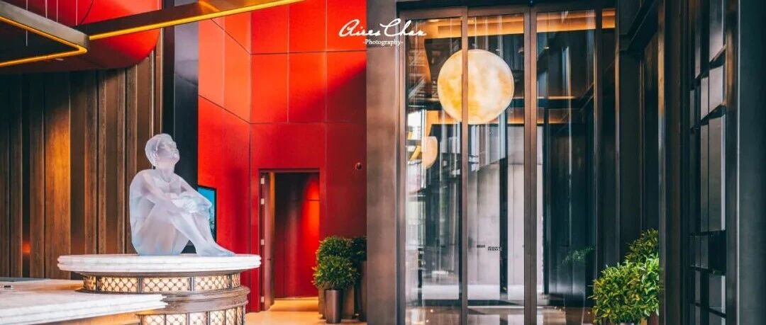 接待台旁静坐的《仰望者》小蓝人艺术品,仰望着悬浮的星球,在喧嚣的闹市中引导客人为自己保留一些静心思考的空间。