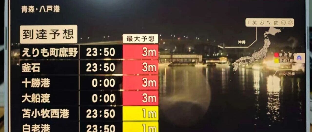 日本气象厅当地时间12月8日23时23分发布海啸警报,预计部分海域将出现最高3米海啸,呼吁沿岸民众高度警戒。