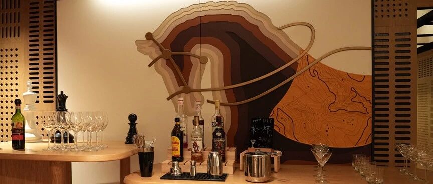 空间以马厩为灵感,天花造型呼应"饲槽"意象。通过一些轻松排布的座椅以及桌游来呈现"班师回营安置兵马"的轻松愉悦心情。