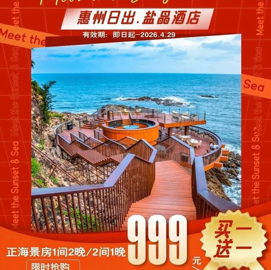惠州双月湾日出·盐晶酒店¥999享海景房2晚(可拆分),含双早,周末清明不加价。可打卡网红礁石酒吧(需预约),泡海泉汤屋,享无边泳池沙滩。未预约可退,适合亲子情侣错峰出游。