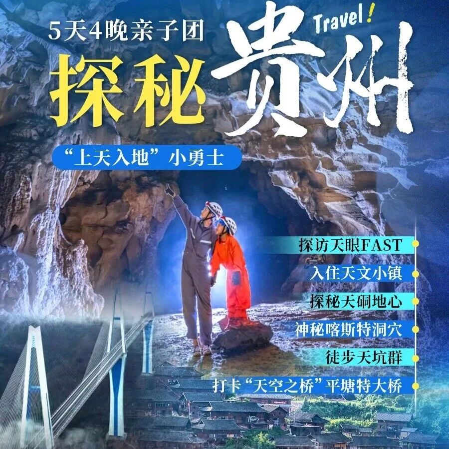 贵州5天4晚亲子行程,硬核科普+轻奢度假:探秘天眼FAST、地心探洞、布依古寨体验。全程住五钻/四钻酒店,专业导师带队,摄影师跟拍。适合4-14岁亲子家庭,成人¥3880起,儿童¥3380起(不占床),春假/五一/暑期出发。退改严格,下单前务必确认成团。