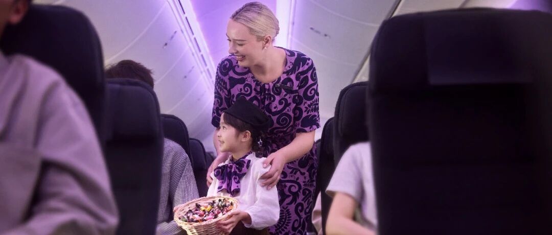 在飞机降落奥克兰之前,小乘客们可以穿上迷你版的纽航空乘制服,和空乘一起给机舱里的旅客发放纽航特色糖果,很多小朋友都特别喜欢这个环节。